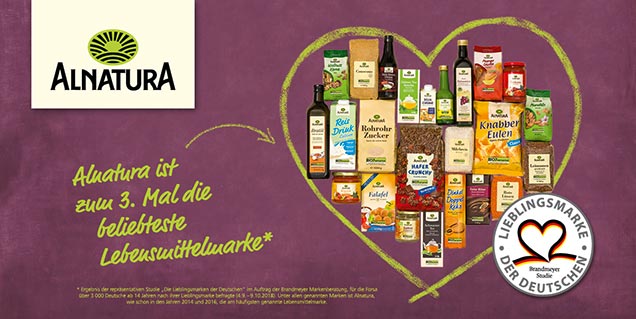 Wir haben die Lieblingsmarke der Deutschen! Sinnvoll für Mensch und Erde sind die guten Produkte von Alnatura: Bio, nachhaltig und einfach lecker noch dazu!